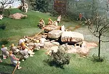 Il ne semble pas que les bœufs aient été employés pour tracter, bien que le joug ait été connu au Néolithique[61]. Les chercheurs pensaient que le transport et l'érection des mégalithes nécessitaient une main-d'œuvre importante réunie au cours de festivités ou cérémonies. L'expérimentation réalisée par Jean-Pierre Mohen en 1979 à Bougon a bousculé plusieurs idées reçues sur les investissements en temps et en main-d'œuvre, sur l'usure, ou sur la densité des populations qui auraient participé aux travaux[Note 9]. Des expériences similaires ont montré que des effets importants peuvent aussi être accomplis avec peu de personnes, bien que lentement[62],[63].