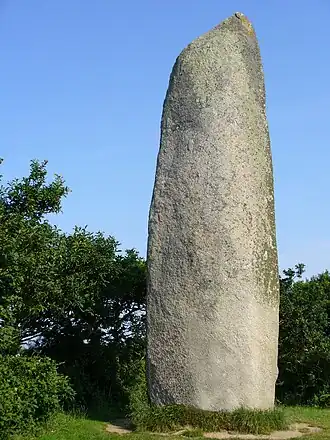 - les pierres dressées[11] plantées verticalement en terre, constituées d'un seul bloc à l'état brut ou retravaillées, qu'elles soient isolées (menhirs, stèles, statues-menhirs, taulas), alignées selon une direction approximative (alignement mégalithique), disposées de manière à constituer des enceintes plus ou moins complètes (improprement appelées cromlechs), associées à des terrassements spécifiques (henges) ;