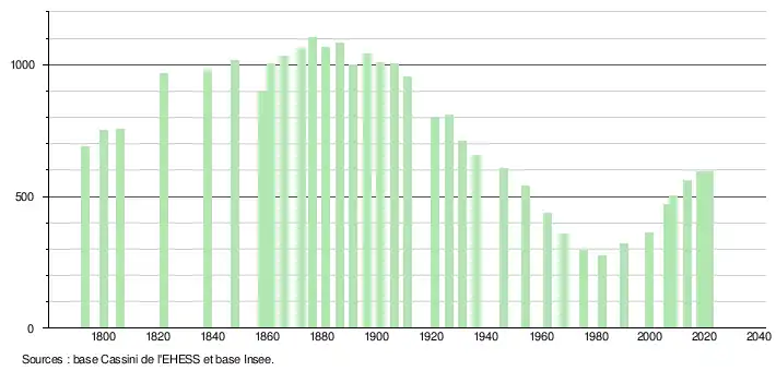 L'évolution du nombre d'habitants est connue à travers les recensements de la population effectués dans la commune depuis 1793. Pour les communes de moins de 10 000 habitants, une enquête de recensement portant sur toute la population est réalisée tous les cinq ans, les populations légales des années intermédiaires étant quant à elles estimées par interpolation ou extrapolation[8]. Pour la commune, le premier recensement exhaustif entrant dans le cadre du nouveau dispositif a été réalisé en 2008[9].