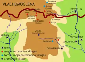 Sur le nombre de locuteurs de mégléno-roumain il y a une estimation concernant seulement ceux de Grèce et de Macédoine du Nord, à 2 800 personnes[1]. Ils vivent surtout dans la région grecque de Macédoine-Centrale, où se trouve la région historique de Mogléna, dans les districts régionaux de Kilkís et de Pella, dans les localités L’úmniță (Σκρα – Skra), Cúpă (Κούπα – Koupa), Țărnaréca (Κάρπη – Karpi), Oșíń (Αρχάγγελος – Archagghélos), Birislắv (Περίκλεια – Périkléia) Lundzíń (Λαγκάδια – Lagkadia) et Nắnti ou Nǫ́nti (Νότια – Notia). En Macédoine du Nord, il y a des locuteurs de mégléno-roumain presque uniquement dans la ville de Gevgelija, où est venue vivre la quasi-totalité des habitants du village Umă (Хума – Huma) majoritairement peuplé de Mégléno-roumains[18].