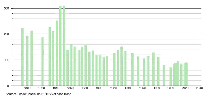 L'évolution du nombre d'habitants est connue à travers les recensements de la population effectués dans la commune depuis 1793. Pour les communes de moins de 10 000 habitants, une enquête de recensement portant sur toute la population est réalisée tous les cinq ans, les populations légales des années intermédiaires étant quant à elles estimées par interpolation ou extrapolation[19]. Pour la commune, le premier recensement exhaustif entrant dans le cadre du nouveau dispositif a été réalisé en 2004[20].