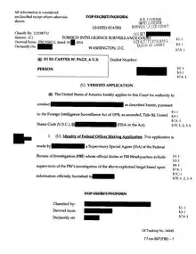 Le mémo Nunes (en angais : Nunes memo ; officiellement : Foreign Intelligence Surveillance Act Abuses at the Department of Justice and the Federal Bureau of Investigation)[3] est un mémorandum de quatre pages rédigé à l'intention du représentant Devin Nunes, par un groupe de travail sous ses ordres, et diffusé publiquement le par le United States House Permanent Select Committee on Intelligence, un comité du gouvernement américain contrôlé par les républicains et dont Nunes est le président. Le mémo allègue que le Federal Bureau of Investigation (FBI) « pourrait avoir invoqué des sources douteuses ou politiquement orientées »[trad 2] dans le but d'obtenir un mandat de la United States Foreign Intelligence Surveillance Court (FISA) en , et des trois renouvellements subséquents, contre l'homme d'affaires Carter Page (en) (propriétaire d'un fonds dont l'essentiel des investissements est fait en Russie et en Asie centrale[4],[5],[6]) et conseiller du président américain Donald Trump, pendant les premières étapes de l'enquête du FBI sur les accusations d'ingérences russes dans l'élection présidentielle américaine de 2016[7]. Le , le département de la Justice des États-Unis publie des versions lourdement expurgées de quatre mandats du FISA contre Carter Page qui montrent que les hypothèses principales du mémo Nunes sont fausses ou trompeuses, ce qui soutient la réfutation des démocrates[8],[9].