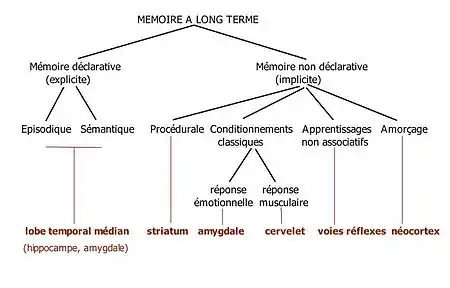 Il existe trois types de mémoire à long terme qui se distinguent par leur contenu. Les mémoires épisodique et sémantique sont regroupées dans la mémoire déclarative.