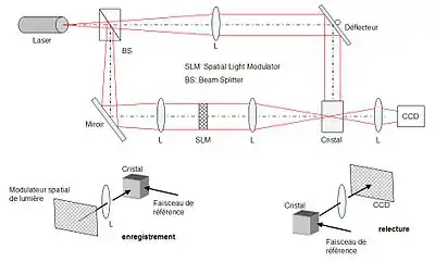 Pour l'enregistrement, le faisceau est agrandi par les lentilles (L), afin d'illuminer complètement un modulateur spatial de lumière (SLM) (en réalité un panneau LCD, ressemblant à une sorte de grille, où les cases « opaques » et « transparentes » représentent respectivement les « 0 » et les « 1 » de l'information à stocker).