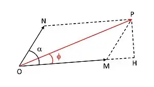Dans le cas de deux ondes concourantes, Fresnel pose ensuite que « l'onde résultant du concours des deux autres, quelles que soient leur positions relatives, répond exactement, pour son intensité et pour sa situation, à la résultante de deux forces égales aux intensités des deux faisceaux lumineux, et faisant entre elles un angle qui soit à la circonférence entière comme l'intervalle qui sépare les deux systèmes d'ondes est à la longueur d'une ondulation[56] ». Ce qui veut dire qu'il propose de représenter les deux faisceaux lumineux par des vecteurs ayant chacun son amplitude propre et qui forment entre eux un angle égal à , étant la différence de marche du rayon 2 par rapport au rayon 1. Cette méthode de superposition de signaux sinusoïdaux est, depuis lors, connue sous le nom de Diagramme de Fresnel ou Représentation de Fresnel, faisant intervenir des vecteurs de Fresnel.