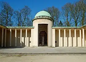 La longue pelouse centrale, dont la symétrie est rompue par un grand hêtre, est rythmée par deux rangées d'ifs taillés en cône et conduit le regard vers le mémorial[7].