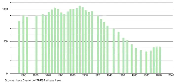 L'évolution du nombre d'habitants est connue à travers les recensements de la population effectués dans la commune depuis 1793. Pour les communes de moins de 10 000 habitants, une enquête de recensement portant sur toute la population est réalisée tous les cinq ans, les populations légales des années intermédiaires étant quant à elles estimées par interpolation ou extrapolation[21]. Pour la commune, le premier recensement exhaustif entrant dans le cadre du nouveau dispositif a été réalisé en 2006[22].