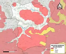 Les mouvements de terrains susceptibles de se produire sur la commune sont des tassements différentiels[17]. Le retrait-gonflement des sols argileux est susceptible d'engendrer des dommages importants aux bâtiments en cas d’alternance de périodes de sécheresse et de pluie[18]. 64,8 % de la superficie communale est en aléa moyen ou fort (54,9 % au niveau départemental et 48,5 % au niveau national)[Carte 2]. Depuis le , en application de la loi ELAN, différentes contraintes s'imposent aux vendeurs, maîtres d'ouvrages ou constructeurs de biens situés dans une zone classée en aléa moyen ou fort[Note 5],[19].