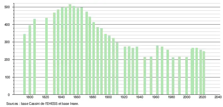 L'évolution du nombre d'habitants est connue à travers les recensements de la population effectués dans la commune depuis 1793. Pour les communes de moins de 10 000 habitants, une enquête de recensement portant sur toute la population est réalisée tous les cinq ans, les populations légales des années intermédiaires étant quant à elles estimées par interpolation ou extrapolation[30]. Pour la commune, le premier recensement exhaustif entrant dans le cadre du nouveau dispositif a été réalisé en 2007[31].