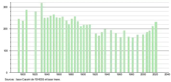 L'évolution du nombre d'habitants est connue à travers les recensements de la population effectués dans la commune depuis 1793. Pour les communes de moins de 10 000 habitants, une enquête de recensement portant sur toute la population est réalisée tous les cinq ans, les populations légales des années intermédiaires étant quant à elles estimées par interpolation ou extrapolation[22]. Pour la commune, le premier recensement exhaustif entrant dans le cadre du nouveau dispositif a été réalisé en 2005[23].