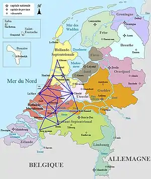 Dans un premier temps, Snellius effectue une triangulation auxiliaire (voir zoom) dont la finalité est de calculer une pseudo-base - non mesurée - de Leyde à La Haye, pour sa triangulation principale.