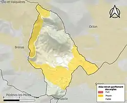 Le retrait-gonflement des sols argileux est susceptible d'engendrer des dommages importants aux bâtiments en cas d’alternance de périodes de sécheresse et de pluie. 40,9 % de la superficie communale est en aléa moyen ou fort (59,3 % au niveau départemental et 48,5 % au niveau national). Sur les 54 bâtiments dénombrés sur la commune en 2019, 46 sont en aléa moyen ou fort, soit 85 %, à comparer aux 85 % au niveau départemental et 54 % au niveau national. Une cartographie de l'exposition du territoire national au retrait gonflement des sols argileux est disponible sur le site du BRGM[22],[Carte 2].