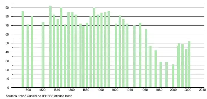L'évolution du nombre d'habitants est connue à travers les recensements de la population effectués dans la commune depuis 1793. Pour les communes de moins de 10 000 habitants, une enquête de recensement portant sur toute la population est réalisée tous les cinq ans, les populations légales des années intermédiaires étant quant à elles estimées par interpolation ou extrapolation[26]. Pour la commune, le premier recensement exhaustif entrant dans le cadre du nouveau dispositif a été réalisé en 2007[27].