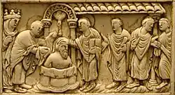 La royauté mérovingienne, comme beaucoup d'autres, nécessite, pour la légitimer, un rituel exprimant et créant le consensus. Ce rituel, l'élévation sur le pavois par les hommes libres, a été attribué à tort à une tradition germanique alors qu'il relève de l'imitation impériale[10]. Il fut utilisé par les empereurs romains élus par leur armée et sa transmission s'est faite d'Orient vers l'Occident au IVe siècle, par le contact entre les peuples germaniques et l'armée romaine. Ce rituel était encore en usage à Byzance à la fin du VIe siècle. Le rituel du pavois relève d'un symbolisme, courant en Orient comme en Occident, dans lequel l'élévation verticale traduit l'accès à la sphère divine, au sacré. L'élévation sur le pavois, qui met en scène un chef militaire et ses soldats, affirme également le caractère guerrier de la royauté et, selon Régine Le Jan[10], lorsque Grégoire de Tours évoque ce rituel dans ses Dix Livres d'Histoire (fin VIe siècle), on comprend à mots couverts qu'il le désapprouve, car il n'est pas contrôlé par les clercs ; pour l'évêque de Tours, ce rituel manifeste l'élection du roi par ses guerriers mais pas son élection par Dieu. De fait, en Occident comme à Byzance, ce rituel disparaît à partir du VIIe siècle, lorsque le clergé monopolise le rituel du couronnement royal.