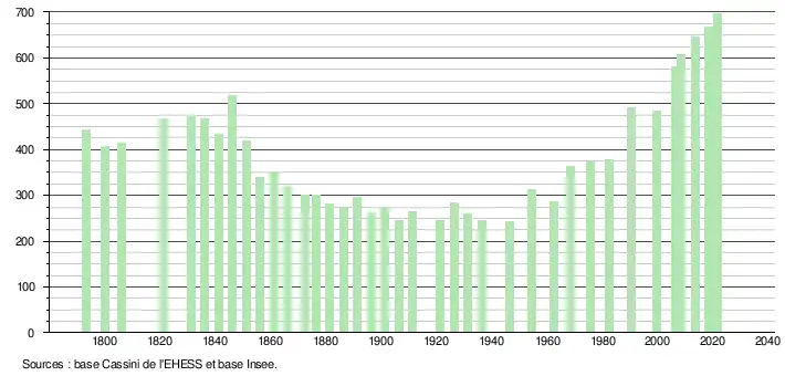 - Population municipale légale en vigueur au 1er janvier 2024, millésimée 2021, définie dans les limites territoriales en vigueur au 1er janvier 2023, date de référence statistique : 1er janvier 2021.