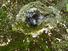 Une à deux couvées par an de 6 à 12 œufs blancs teintés de rose et pointillés de rouge, la première entre mi-avril et mi-mai, la seconde en juin. Contrairement aux Paridés (les autres mésanges), elle ne construit pas son nid dans des cavités mais dans un endroit dégagé. La forme du nid est ovoïde (ou en forme de boule[5]). C'est un nid d'une hauteur de 20 cm complètement fermé avec un petit orifice latéral dans la partie supérieure. Il est composé à l'extérieur de mousse, de fibres végétales et de morceaux d'écorce ; l'intérieur est garni de plumes et de poils. Sa construction dure entre 15 et 20 jours. Les œufs sont couvés par la femelle 13 ou 14 jours. Les petits restent au nid entre 15 et 20 jours après l'éclosion.