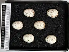Une première couvée est pondue en avril, puis parfois une seconde en juin. Les couvées comptent de 7 à 10 œufs de 16 mm blancs, avec des taches marron. L'incubation est assurée par la femelle elle dure de 13 à 15 jours. Les oisillons prennent leur premier envol après 16 à 20 jours et quittent le nid après 20 à 22 jours[2],[3].