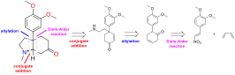 En 1971, Shun-ichi Yamada a rapporté la première synthèse totale asymétrique de la (+)-mésembrine. Le carbone quaternaire est introduit par une annélation de Robinson asymétrique promu par un dérivé L-proline[12].