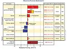 Contribution énergétique du Soleil au réchauffement climatique, d’après les chiffres publiés en 2007 par le GIEC. La contribution des différents mécanismes qui refroidissent ou réchauffent est exprimée en W/m²