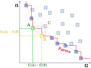 Lorsqu’une solution est associée à une seule valeur, on parle de problème mono-objectif, lorsqu’elle est associée à plusieurs valeurs, de problème multi-objectifs (ou multi-critères). Dans ce dernier cas, on recherche un ensemble de solutions non dominées (le « front de Pareto »), solutions parmi lesquelles on ne peut décider si une solution est meilleure qu’une autre, aucune n’étant systématiquement inférieure aux autres sur tous les objectifs.