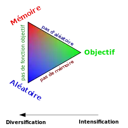 La diversification (ou exploration, synonyme utilisé presque indifféremment dans la littérature des algorithmes évolutionnaires) désigne les processus visant à récolter de l'information sur le problème optimisé. L'intensification (ou exploitation) vise à utiliser l'information déjà récoltée pour définir et parcourir les zones intéressantes de l'espace de recherche. La mémoire est le support de l'apprentissage, qui permet à l'algorithme de ne tenir compte que des zones où l'optimum global est susceptible de se trouver, évitant ainsi les optima locaux.