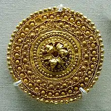 Bulla étrusque[alpha 19][46],[45],[44] ouvragée en or (actuellement conservée au Museo Gregoriano Etrusco[61]).