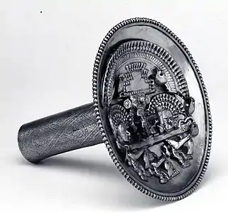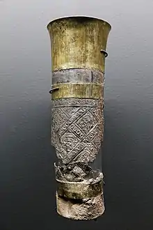 - des gobelets aux parois évasées, ornés de personnages ou de dessins géométriques en repoussé ou incrustés de pierres de couleurs,