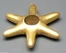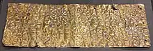- le second enfermait une autre couronne d'or, deux pectoraux en forme de H, deux plaques rectangulaires, de la poterie et des perles de pierre;