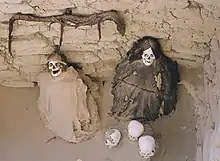 - Le premier contenait un seul corps avec une couronne en feuille d'or, trois vases Cupisnique, trois grandes conques marines et des bijoux de pierre bleu vert ;
