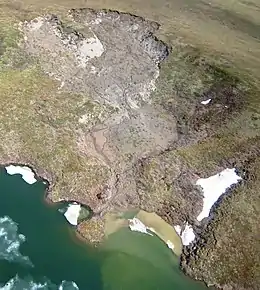 Le dégel du pergélisol entraîne la formation de lacs thermokarstiques dans les dépôts de yedoma riches en glace[45]. (Le méthane gelé dans le pergélisol est lentement libéré à mesure que le pergélisol fond.)