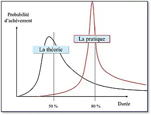 - la durée d’une tâche est généralement surestimée par des coussins (tampons) successifs, réserve provisionnée par chaque personne intervenant dans l’évaluation. Ainsi, la théorie devrait nous montrer que la majorité des tâches ont une durée médiane définie par la méthode de calcul PERT : (Durée optimiste + 4*Durée probable + Durée pessimiste) / 6 . Or, la pratique nous met en avant d'autres comportements comme la loi de Parkinson.
