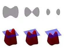 Une façon efficace bien que très simple de comprendre la méthode dans le cas d'interfaces à deux dimensions consiste à étudier l'illustration ci-contre avant de poursuivre avec une définition un peu plus technique qui sera ainsi d'accès plus facile. La figure de droite illustre plusieurs idées importantes sur la méthode. En haut à gauche nous voyons une courbe, c'est-à-dire une région bornée par une frontière régulière. Au-dessous, la surface rouge représente une fonction qui détermine cette forme, le plan bleu étant le plan (x,y). Le bord de cette forme est alors la courbe de niveau de tandis que la forme proprement dite est l'ensemble des points pour lesquels est positif ou nul.