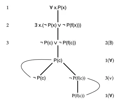 Pour les formules de type , on utilise la skolémisation : on remplace par une constante fraîche dans et on l'ajoute à la branche.