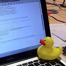 La méthode du canard en plastique consiste à expliquer méticuleusement le code source que l'on a écrit à un collègue, à un simple passant, ou même à un objet inanimé comme un canard en plastique[1],[2]. Le simple fait d'exprimer ses pensées à voix haute est censé aider à trouver les erreurs de programmation. Comme les réactions de l'interlocuteur ou son niveau de compréhension du problème n'ont aucune importance dans ce processus, il est possible de le remplacer par un canard en plastique.