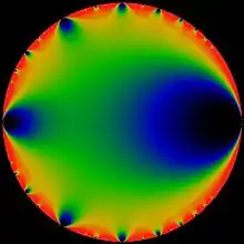 Pour une fonction thêta typique, le point « le plus important » du cercle unité est, comme sur le diagramme coloré ci-contre, en z = 1, suivi par z = –1, et ensuite les deux racines cubiques primitives de l'unité j et j2 ; puis viennent les racines quatrièmes i et –i, etc. Ceci ne garantit en rien que la méthode analytique va marcher, mais explique l'apparition de la suite de Farey.