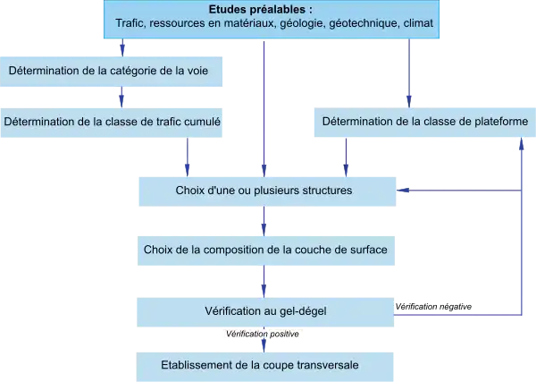 Le dimensionnement d’une chaussée consiste à déterminer la nature et l’épaisseur des couches qui la constituent afin qu’elle puisse résister aux diverses agressions auxquelles elle sera soumise tout au long de sa vie. La méthode française de dimensionnement est une méthode dite semi-empirique, c'est-à-dire qu'elle tient compte à la fois de l’observation des chaussées existantes, et de modèles mécaniques de comportement des matériaux et des assises de chaussées. Des catalogues de structures types ont été élaborés afin de permettre de choisir très simplement le dimensionnement pratique des structures d’une chaussée en fonction du trafic supporté, du type de voie et de la plateforme support. Le catalogue en vigueur en France est celui de 1998[1].