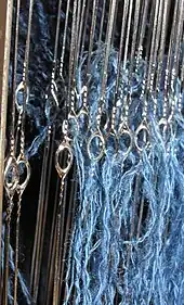 13 : Lisses ou lices : aiguilles métalliques qui supportent les fils de chaîne par l’intermédiaire des mailles ou maillons.