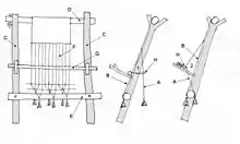 Le métier vertical à pesons[1] est constitué de deux montants verticaux (C) reliés à leurs sommets par une barre ronde appelée l’ensouple (D) sur laquelle s’enroule le tissu (Ces montants dit verticaux ne le sont pas tout à fait verticaux car ils sont en général appuyés contre un mur et font donc un angle avec ce mur). De l’ensouple pendent verticalement les fils de chaîne (F). Les fils de chaîne sont divisés en deux groupes pour une armure simple (armure toile), les fils pairs et les fils impairs. Une traverse inférieure horizontale (E) sépare les fils pairs des fils impairs. Les fils pairs (A) pendent perpendiculairement au sol, derrière la traverse inférieure et font un angle avec les montants. Les fils impairs (B) sont appuyés sur la traverse inférieure et sont parallèles aux montants. L’espace entre les deux nappes de fils de chaîne se nomme la foule naturelle (1).