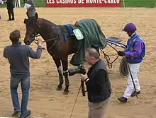 Les jockeys et les drivers montent ou conduisent les sulkys, et se déplacent dans les différents hippodromes. Les critères physiques sont stricts et nécessitent de suivre les règles de vie des sportifs de haut niveau. En effet, le poids d'un jockey est réglementé : environ 50 kg pour 1,55 m en plat, jusqu'à 60 kg pour 1,70 m en obstacles[11]. Un jockey peut débuter comme apprenti au sein d'une écurie, chez un entraîneur précis. S'il atteint une renommée suffisante grâce à ses succès, il pourra travailler pour plusieurs entraîneurs et propriétaires. Un jockey de renom peut être appelé spécifiquement pour monter un cheval dans une course donnée. Les jockeys ont la plupart du temps une spécialité en course de plat, mais certains peuvent faire carrière dans plusieurs disciplines du sport hippique. Driver est une profession qui s'exerce rarement seule, mais souvent en doublon avec la profession d'entraîneur. En France, les jockeys sont titulaires soit d'un CAPA lad-cavalier d’entraînement, d'un CAPA soigneur d’équidés, soit d'un Bac pro conduite et gestion de l’entreprise hippique ou conduite et gestion de l’exploitation agricole à dominante élevage[10]. Le CAPA peut être obtenu dans une école AFASEC (Association pour la formation et l'action sociale dans les écuries de courses) ou MFR. En France, le jockey perçoit un fixe autour de 1 400 € net en 2014, auquel s’ajoute un pourcentage du prix en cas de monte gagnante : 5 % pour le trot, 10 % pour le plat, et 9 % pour l’obstacle[12]. En Australie et aux États-Unis, le jockey est considéré comme un travailleur indépendant, mais n'est pas autorisé à parier sur les courses.