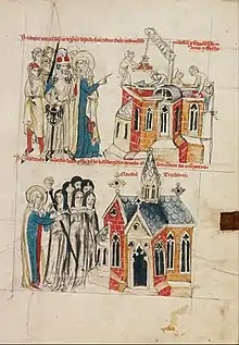 Soins chirurgicaux selon un manuscrit anglais du XIe siècle : à gauche, patient atteint de goutte aux pieds que l'on incise et cautérise, à droite en haut patient atteint de hernie inguinale, à droite en bas opération des hémorroïdes.