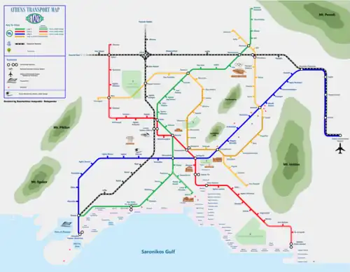 Le métro d’Athènes (grec moderne : Μετρό Αθήνας, Metró Athínas) est un des moyens de transport en commun desservant l'agglomération athénienne. Exploité depuis 2011 par la STASY S.A.[5], il comporte trois lignes en site propre sur rail totalisant 69 km dont 38 km souterrains, plus 21,2 km partagés avec le réseau de l'OSE. Le réseau du métro est complété par un réseau de tramway, ainsi que par un réseau de lignes ferroviaires de banlieue.