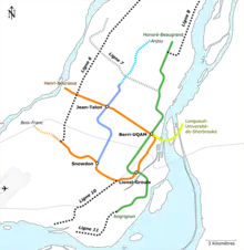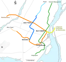 Notes : * Sur la ligne orange, depuis Côte-Vertu, les trains ont deux terminus : Henri-Bourassa ou Montmorency, selon ce qui est indiqué à la tête du train. Ainsi, seuls les trains ayant comme terminus Montmorency desservent les stations de Laval (Cartier, De la Concorde et Montmorency) les autres trains arrêtent à Henri-Bourassa. Dans la direction inverse, certains trains partent de la station Montmorency et d'autres d’Henri-Bourassa. De plus, le matin, deux trains au départ spécial d’Henri-Bourassa ont comme terminus Montmorency. La station Henri-Bourassa est de ce fait la seule station de la ligne orange où tous les trains de cette ligne transitent. * Il n'y a jamais eu de ligne 3. Il s'agissait d'un projet d'aménagement d'une ligne du Canadien National qui aurait nécessité des roues d'acier au lieu de pneus et qui n'aurait pas été souterraine (hormis la portion du tunnel sous le mont Royal, d'une longueur de 5 kilomètres). Le projet a été abandonné au profit de la ligne jaune pour permettre un accès facile à l'île Sainte-Hélène lors de l'Expo 67. Le tunnel et la ligne du CN sont toujours utilisés par les trains de banlieue Montréal-Deux Montagnes et Montréal-Mascouche de l'AMT. | ||||||||||