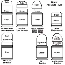 • M651 CS Round : Cette munition lacrymogène est gris aluminium avec un emballage vert et des marquages noirs. Bien qu'elle soit à usages multiples, elle est surtout efficace pour le contrôle des mouvements de foule et les opérations urbaines. Elle s'arme à une distance comprise entre 10 et 30 m et produit un nuage blanc de gaz CS à l'impact[5] ;