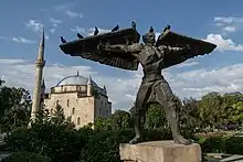 Le monument de Maître Manol devant la mosquée Ibrahim Pacha à Razgrad.