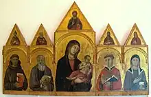 Ce polyptyque comportait à l'origine cinq panneaux: une Vierge à l'Enfant (aujourd'hui à Copenhague), entourée de quatre saints (saint Jean Baptiste (New Haven), saint Pierre (id.), saint Antoine de Padoue (La Spezia) et saint François (Cracovie), disposés vraisemblablement de manière très similaire aux polyptyques de Montespecchio et n°33 de Sienne. Ce polyptyque diffère cependant des deux précédents, car on y perçoit déjà l'influence du gothique élégant de Simone Martini (formes élancées, pose relâchée, eurythmie de l'enfant...)[19]. Il appartient donc à un stade plus avancé.