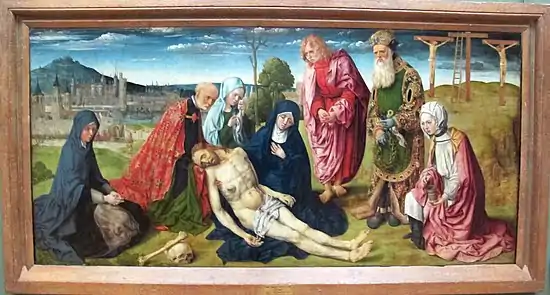 La Pietà de Saint-Germain-des-Prés est un tableau de grande largeur, de dimensions 97,3 × 198,5 cm. Il se trouve au Musée du Louvre[4]. Le paysage à gauche de la Pietà montre un panorama de Paris vu du Sud. On voit d'abord l'abbaye de Saint-Germain-des-Prés avec ses trois tours puis, au-delà de la Seine, le Palais du Louvre et l'hôtel du Petit-Bourbon. Au fond, la butte de Montmartre. Les personnages autour de la Vierge et du Christ de la Déploration sont Joseph d’Arimathie, une Marie, saint Jean, Nicodème et Marie-Madeleine, groupés en un demi-cercle aéré, les riches brocarts dorés qui rappellent le Maître de la Sainte Parenté le Jeune, le rendu avec précision et même préciosité dans les accessoires que l'on voit aussi chez le Maître de saint Barthélemy, sont ici placés un paysage vaste, avec une réelle profondeur, dans un panneau de retable de grande largeur. En particulier Nicodème, qui dans ses mains gantés de bleu tient la couronne d'épines et les clous, est vêtu d'un habit d'une richesse extrême, avec des bordures sertis de pierres colorées. Le choix des couleurs du Christ, avec les plaies bleuies, les pieds énormes, et les visages ravagés se retrouvent chez les artistes colonais de la fin du siècle. L'extrême grâce des figures féminines rappelle le Maître de la Saint Barthélemy.