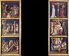 Du Triptyque avec scènes de la Passion, seule sont conservés les volets. Ils sont au Wallraf-Richartz Museum (WRM 38-43). L'intérieur des volets est partagé en trois panneaux. Le volet gauche, de haut en bas, contient trois doubles scènes : le mont des Oliviers et l'arrestation, le Christ devant Pilate et la flagellation, le couronnement d'épines et le portement de croix. Le volet droit, de haut en bas, contient trois sènes simples : la crucifixion, la descente de la croix, la mise au tombeau. Chacun des six panneaux mesure environ 32,5 × 35 cm. Les figures du premier groupe sont plus petites et plus animées que celles du second. La technique et le coloris sont les mêmes[4]. L'extérieur des volets en partagé en deux panneaux. Les deux panneaux du bas, se faisant face, contiennent l'ange de l'annonciation et la Vierge. Au dessus, une Vierge adorant l'enfant Jésus (dans une collection privée). Ces panneaux sont plus haut, de dimension 49 × 35 cm.