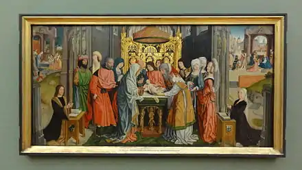 La Circoncision est considéré comme « le chef-d'œuvre de sa maturité »[3] avec le retable de la Sainte Parenté. Ce retable provient de l'église Sainte-Colombe de Cologne. Actuellement à Munich, Alte Pinakothek[20], le tableau est un don du conseiller municipal Johann von Questenberg et de son épouse. Les deux protagonistes principaux, Marie et le prêtre s’apprêtant à effectuer l'opération, sont entourés d'une foule de personnages superbement habillés, les femmes coiffées et portant bijoux. La scène se déroule dans un temple avec des piliers eux-mêmes décorés de statues en grisaille. La table d'opération est portée par trois pieds en forme de séraphins. Le prêtre a une main gantée, l'autre gant est posé sur le plateau. Les deux donateurs prient sur des prie-dieu portant leurs blasons respectifs. Ces blasons sont répétées dans le haut des vitres du temple. En haut à gauche une Nativité, en haut à droite une Adoration des Mages devant une place entourée de nombreux bâtiments.