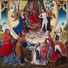 - Autre panneau de dévotion, une prière d'intercession plus grande (98 × 99 cm) et plus colorée[12], vers 1470/75, est au Wallraf-Richartz-Museum. Dans ce tableau, la Vierge est allaitante (Virgo lactans), Jésus montre ses plaies, et il y a un monogramme (IM ?) représenté par une succession de carreaux décorés dans le carrelage du sol. Dieu est avec eux dans une mandorle. Les autres saints intervenant dans le registre terrestre sont l’apôtre Jean et Jean-Baptiste à gauche, Cécile et Colombe de Sens à droite.