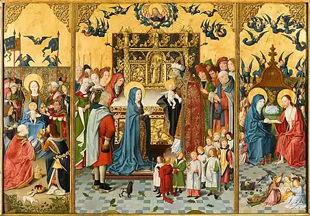 En position ouverte, le retable montre de gauche à droite des scènes de la vie de Marie : l'Annonciation, La Nativité sur les volets extérieurs, l'Adoration des mages, puis la Présentation de Jésus au Temple au centre, suivi de l'Apparition du Christ à la Vierge ; sur les volets extérieurs enfin l'Ascension et pour finir l'Assomption. Les peintures comportent chacune une partie supérieure avec de nombreux anges ou angelots; les sols sont, dans la partie centrale notamment, carrelés avec soin; deux chiens de compagnie se promènent autour les personnages; un grand soin est mis, ici aussi, à l'élégance des costumes et des étoffes. Les objets précieux des trois mages sont complaisamment montrés. La scène centrale montre la Vierge avec les deux colombes d'offrandes, pendant que Joseph, tenant dans une main une pièce, en cherche une autre dans sa besace. L'autel derrière les personnages est incrusté d'images de l'Ancien Testament : au centre Moïse avec les tables de la loi, à gauche Caïn et Abel, à droite peut-être l'arche de Noé. De nombreux personnages secondaires entourent les protagonistes, et une cohorte de petits enfants entre par la droite. Le chien de compagnie, rasé de moitié, montre des rangées de dents improbables.